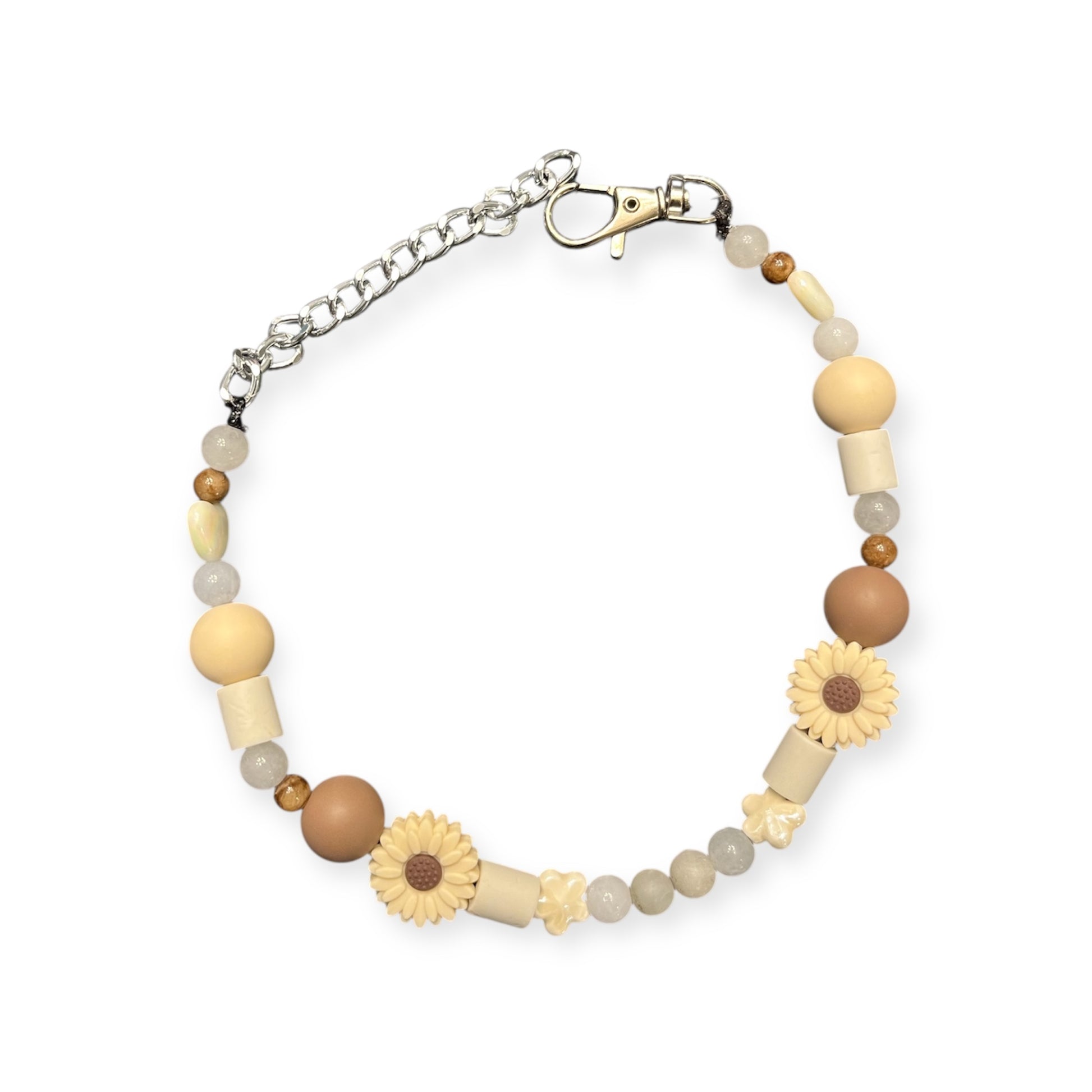 Für diese Kette wurden Quarzsteinperlen sowie Tigeraugenperlen eingearbeitet.