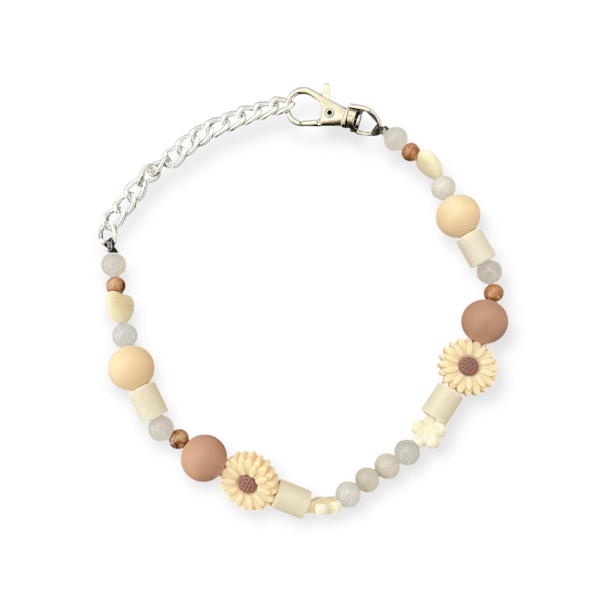 Das Zeckenhalsband ist aus Heilsteinen, Silikonperlen und EM Keramik Perlen.