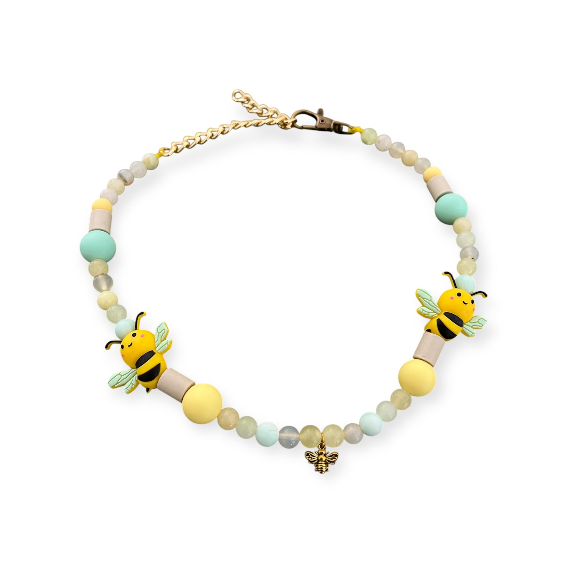 Das Zeckenhalsband ist aus Heilsteinen, Silikonperlen und EM Keramik Perlen.
