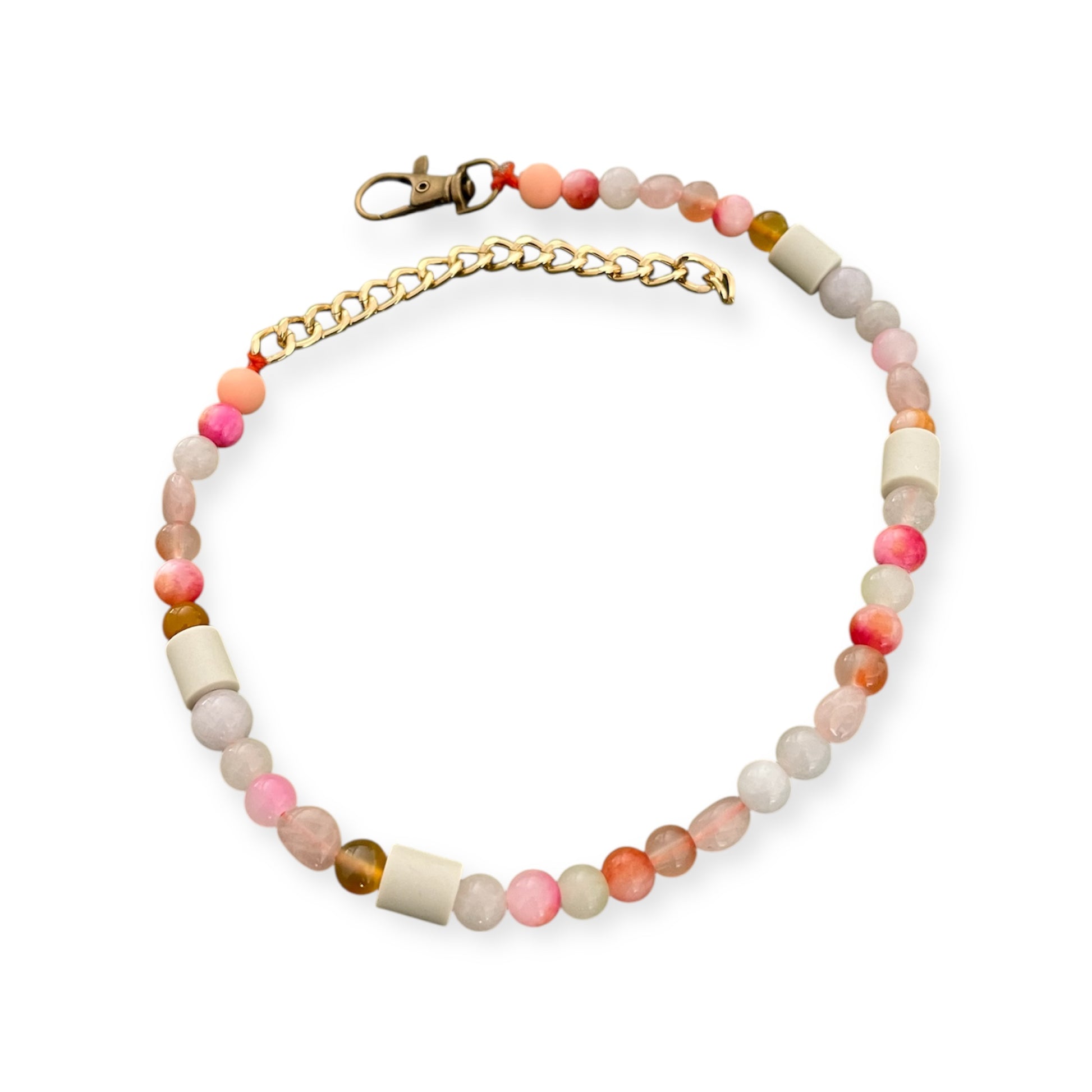 Das Zeckenhalsband ist aus Heilsteinen, Silikonperlen und EM Keramik Perlen.